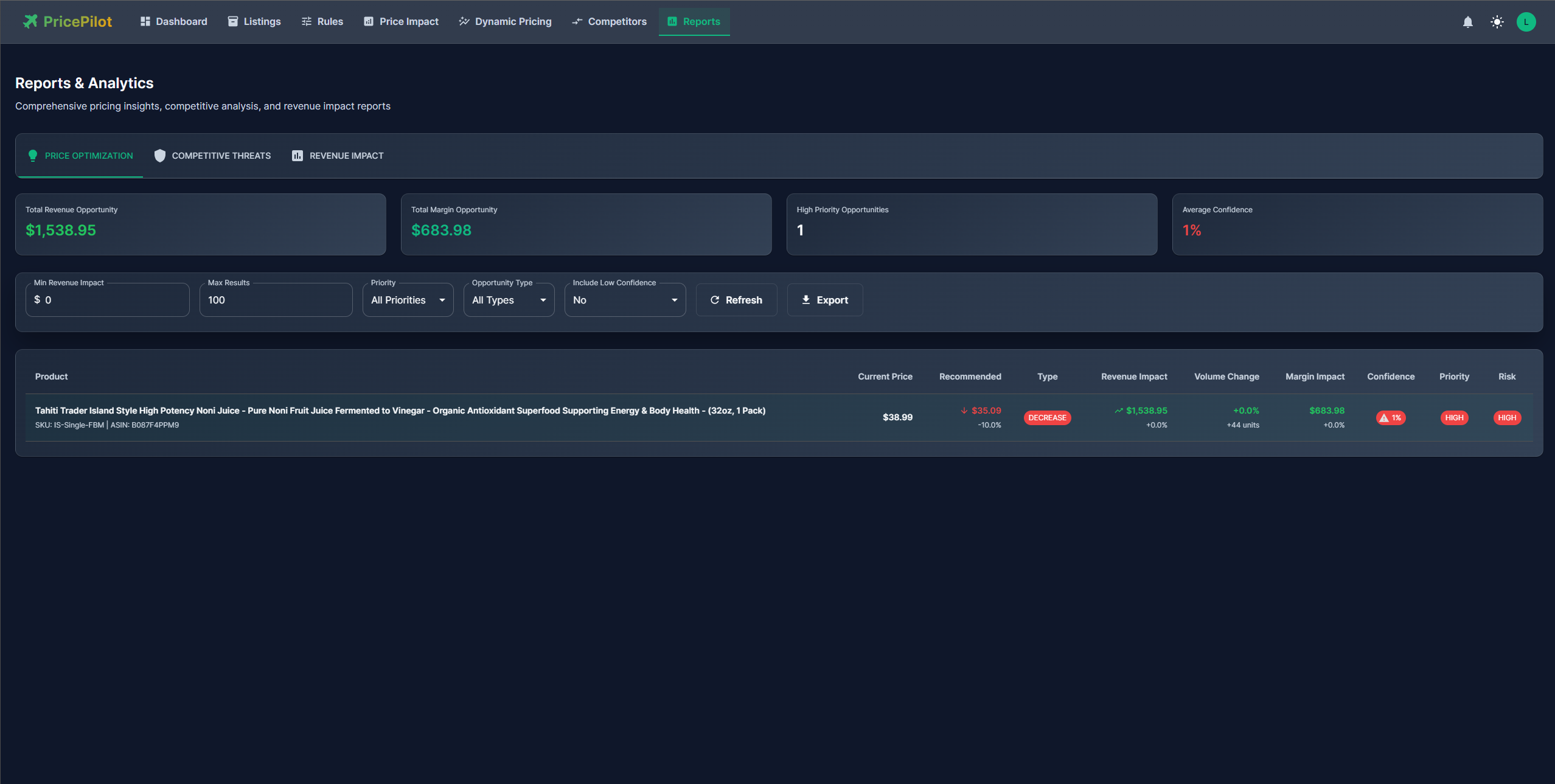 PricePilot analyzes market behavior + price impact + your costs to set prices that protect margins and grow revenue automatically.